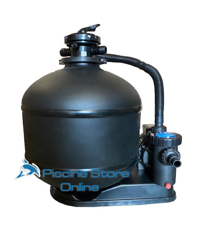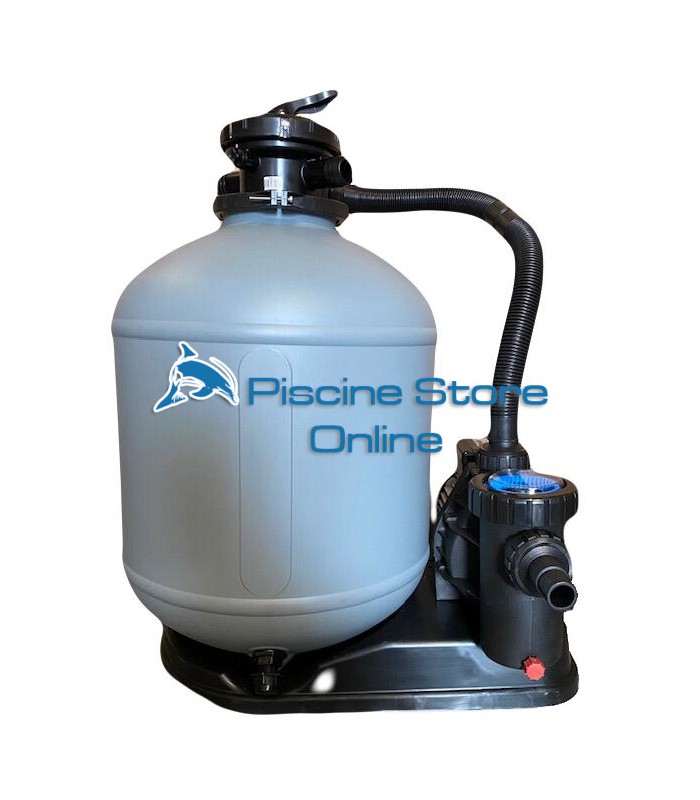 Il filtro a sabbia è realizzato in polipropilene ad alta resistenza (2 bar), con un collettore centrale con diffusore interno a 6 elementi. Perfetto per piscine fuori terra. Made in Italy. Pompa dotata di cestello prefiltro cattura sporco. Include una valvola a 6 vie, tubazione di collegamento e manometro.