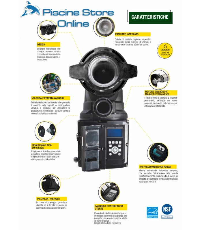 Pompa ultra silenziosa, elettronica a velocità variabile - magneti permanenti per filtrazione piscina DAB ESWIM. Pompa DAB 1,50 HP e 3 HP monofase. Motore autodescante con pre-filtro incorporato. Utilizzo anche per acqua salata.