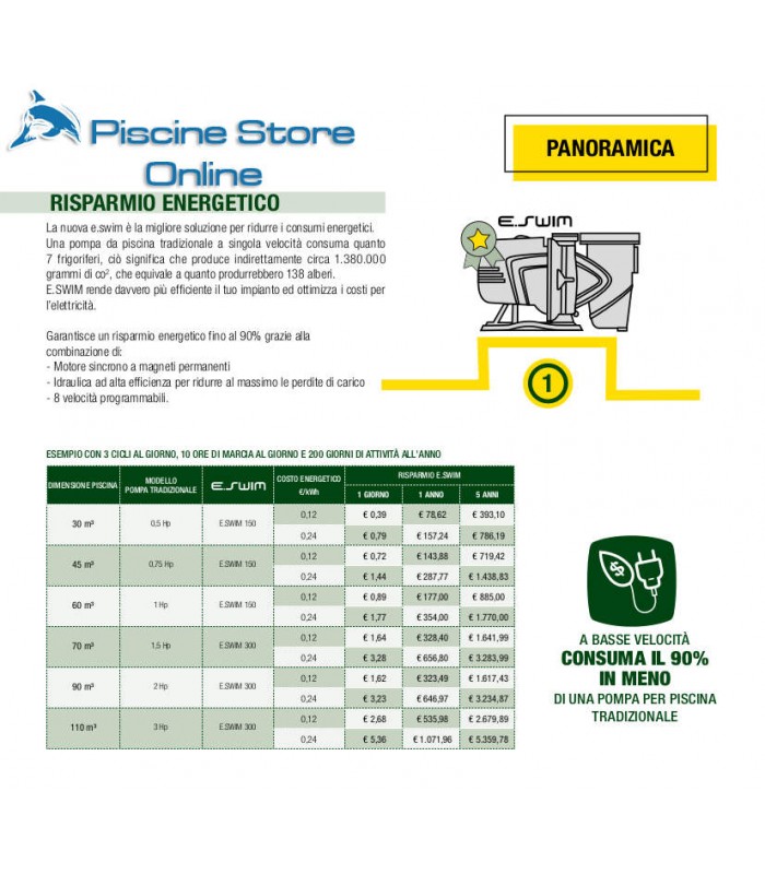 La pompa Eswim è una pompa elettronica a motore sincrono, a magneti permanenti a velocità variabile per la filtrazione delle piscine con rotore incapsulato magnetizzato