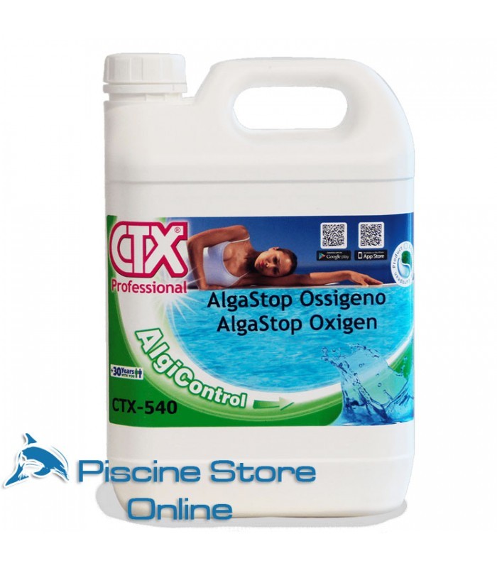 Antialghe piscina microbicida CTX-540 specifico per l'utilizzo nelle piscine con trattamento di disinfezione con ossigeno. Confezioni disponibili da 5 lt. da abbinare all'ossigeno piscina granulare o pastiglie CTX-100/GR o CTX-100.