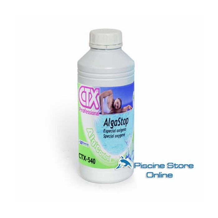 Antialghe piscina microbicida CTX-540 specifico per l'utilizzo nelle piscine con trattamento di disinfezione con ossigeno, non sciumogeno. Confezioni disponibili da 5 lt. da abbinare all'ossigeno piscina granulare o pastiglie CTX-100/GR o CTX-100.