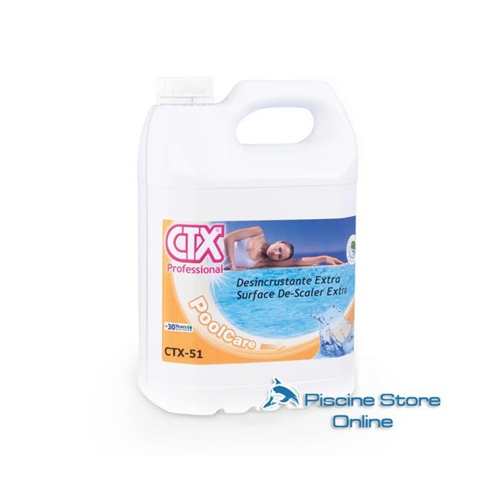 Disincrostante piscina extra forte CTX-51, confezione da 5 lt. Disincrostante piscina liquido per l'eliminazione del calcare e dei residui di sporco organico o minerale adatto alle piscina con rivestimento pvc, verniciate, con rivestimento in gres o piscine in plastica.